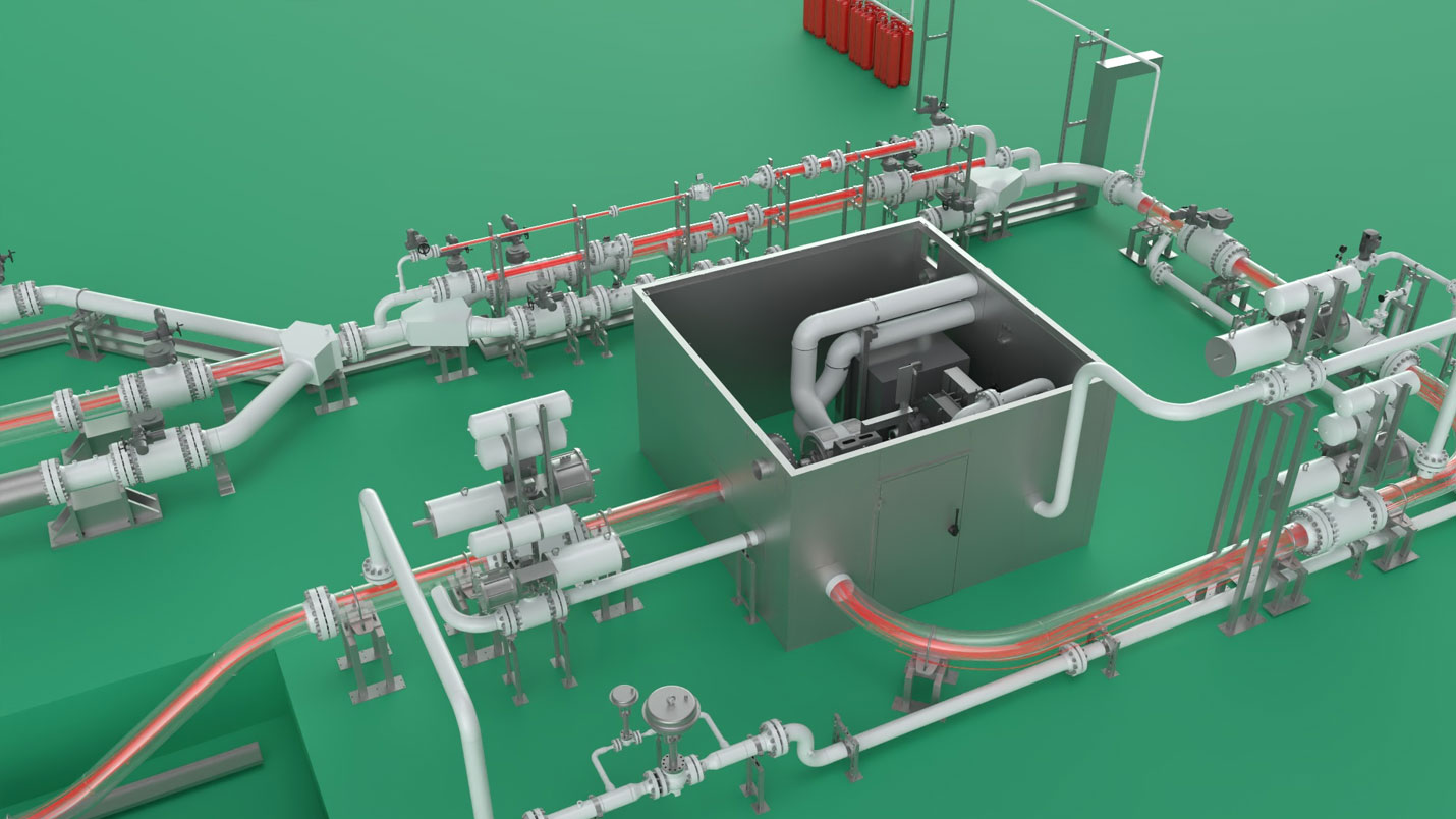 In the explanatory video, the gas flows as red lines and bubbles through the pipes in the various areas. In order to be able to see inside the pipes, the pipes were shown transparent in places.
