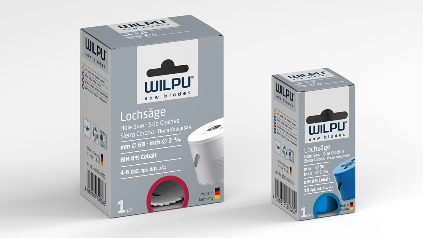 3D visualizations for a brand identity with newly designed product packaging and product printing on drill bits and saw blades.